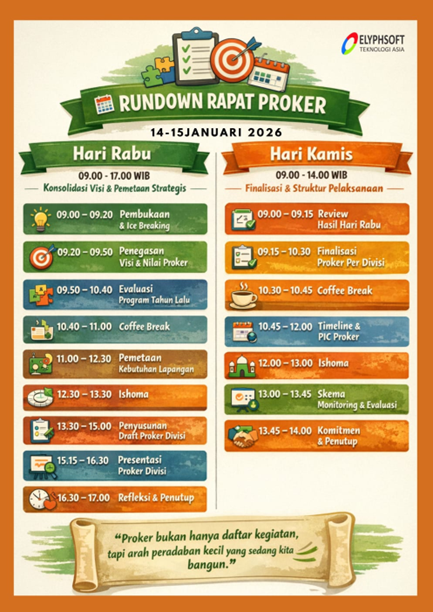 Elyphsoft Teknologi Asia successfully conducted a Strategic Program Planning Meeting (Rapat Program Kerja / Proker) on January 14–15, 2026, as part of its ongoing commitment to strengthening organizational alignment, performance, and sustainable growth.